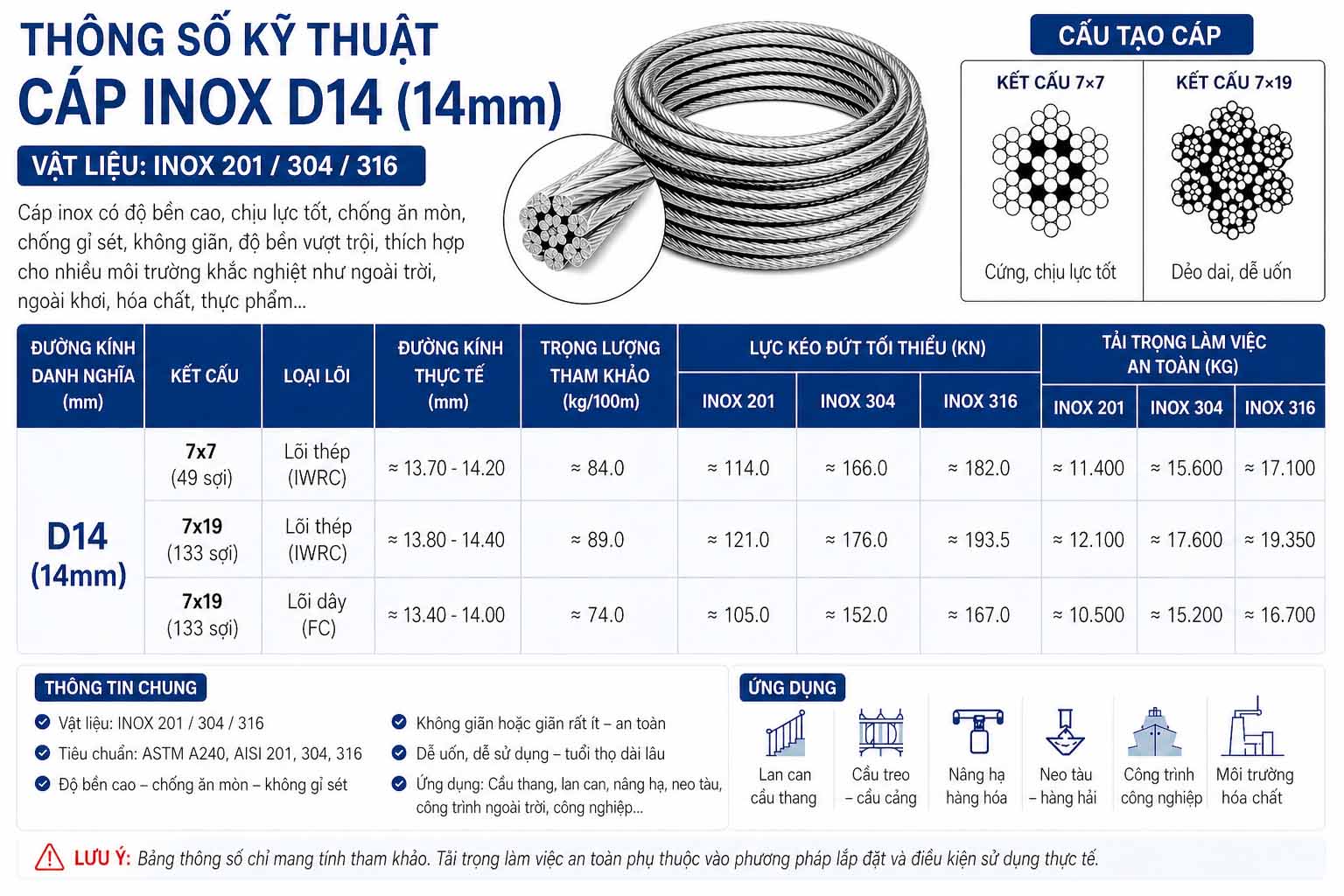 Cáp inox D14 (hay cáp inox phi 14) là loại dây cáp làm từ thép không gỉ (phổ biến nhất là inox 304 hoặc 316) với đường kính danh định là 14mm. Đây là loại cáp phi lớn, nổi bật với khả năng chịu lực kéo cực tốt, chống oxy hóa cao và bề mặt sáng bóng thẩm mỹ.