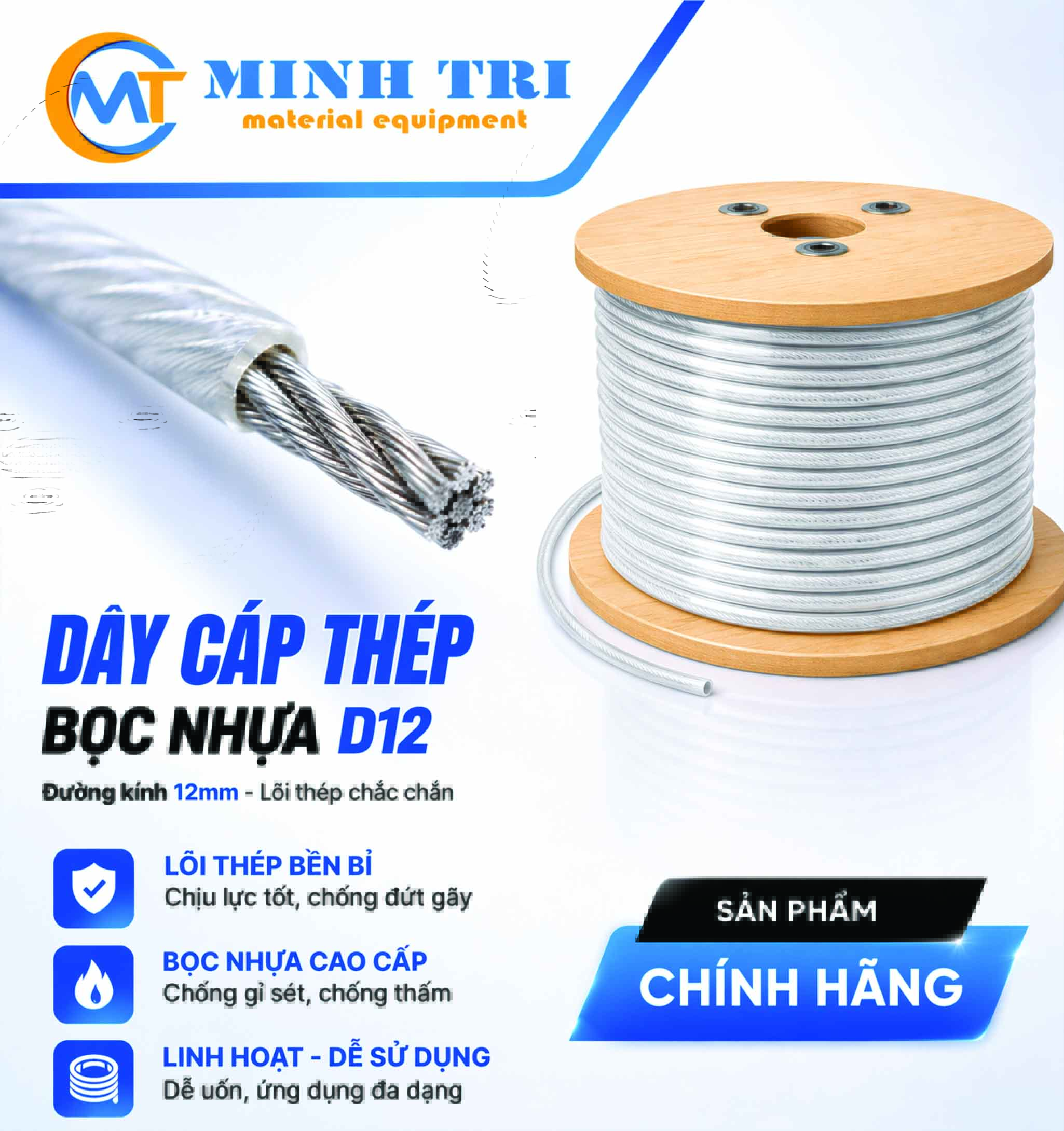 Cáp thép bọc nhựa D12 là dòng cáp thép có đường kính lõi thép khoảng 12mm, bên ngoài được phủ một lớp nhựa PVC hoặc PE nhằm tăng độ bền, chống ăn mòn và bảo vệ cáp trong quá trình sử dụng.